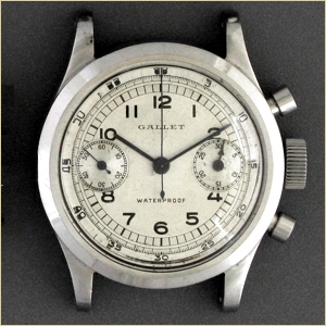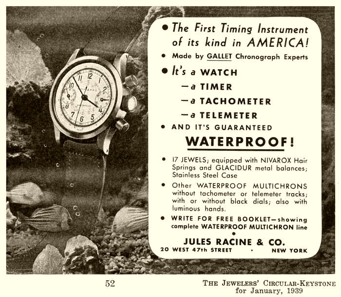 Reprint of a 1939 Jewelers' Circular Keystone advertisement for the Gallet MultiChron 30M CLAMSHELL, the world's first "waterproof" chronograph
