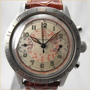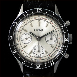 Notes: 12 hr. recording, rotating 12 hr. time zone bezel, telemeter & tachometer scales, block GALLET logo