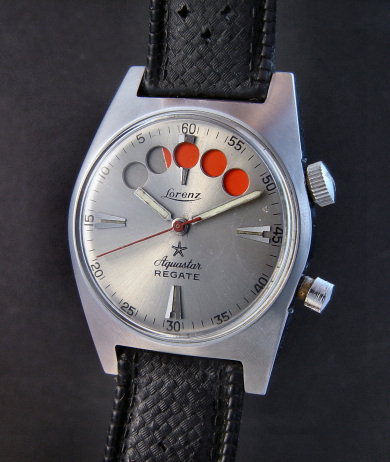 On retrouve également un calibre Lémania dans une montre Stop-en vol très spéciale sortie vers 1967 : l'Aquastar Régate.